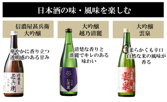 3本を飲み比べることで「甚兵衛の甘味」「清麗のキレ」「雲泉の辛口」のそれぞれの違いがより一層際立って味わうことができるはずだ。
