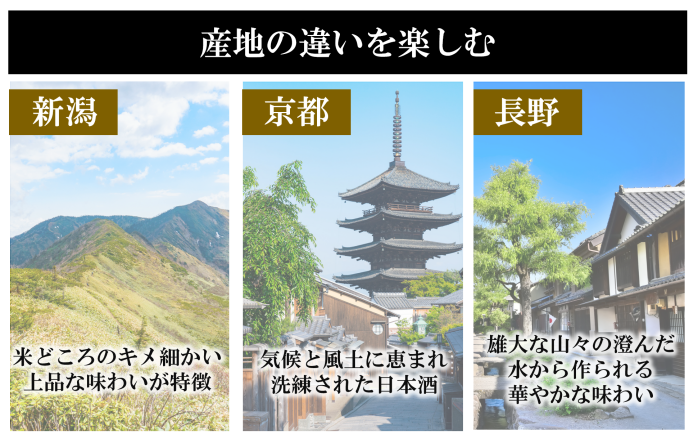 新潟の「キメ細かさ」、京都の「深みのある洗練さ」、長野の「瑞々しさ」など、産地ならではの特徴を味わうことができる。