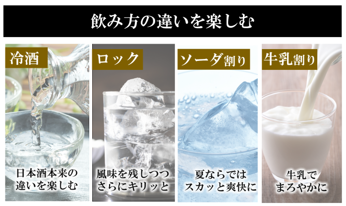 「ロック」「ソーダ割り」そして「牛乳割り」など、割り方を変えるだけで、様々な味わいを楽しむことができる。