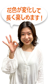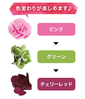 長くお楽しみいただけるフェアリーアイは、初夏から秋にかけてピンク、グリーン、チェリーレッドへと花色が変化します。咲き始めから咲き終わりまでフリルのような花びらをお楽しみいただけます。