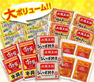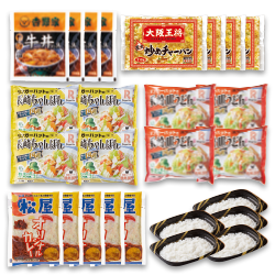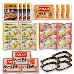 内容量:●吉野家 牛丼の具120g×4袋●大阪王将 炒めチャーハン210g×4袋●リンガーハット 長崎ちゃんぽん305g(めん150g、具材132g、スープ23g)×4袋●リンガーハット 長崎皿うどん244g(めん67g、具材132g、スープ45g)×4袋●大阪王将 ジャンボ餃子350g(10個入)×3袋●あきたこまち冷凍パックご飯150g×5食