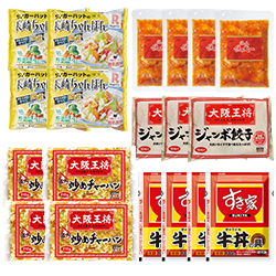 内容量:●すき家牛丼の具135g×4袋(2袋×2セット)●大阪王将炒めチャーハン210g×4袋●陳建一エビチリソース150g×4袋●大阪王将ジャンボ餃子〈350g(10個入)〉×3袋
