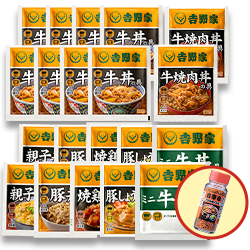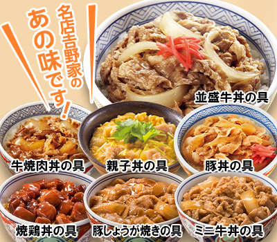 みんな大好き!吉野家の牛丼。お店になかなか行けない方や、いろいろな味を楽しみたい!という方のために、牛丼・豚丼・親子丼・焼肉丼・焼鶏丼・豚しょうが焼の具・ミニ牛丼の具の7種セットを作りました!