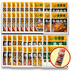 内容量:●牛丼の具 120g×16袋●豚丼の具 120g×4袋●牛焼肉丼の具 120g×4袋●親子丼の具 120g×4袋●焼鶏丼の具 120g×4袋●豚しょうが焼きの具 120g×4袋●ミニ牛丼の具 80g×4袋◎唐辛子30g