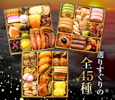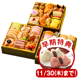 内容量 :●オリジナルおせち彩寿/和洋中三段重(盛付済)/約2-3人前/全45種/特典:紅白たいやき/風呂敷付き