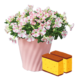 お届け内容:サフィニアアートももいろハート5号、母の日カード、お手入れのしおり、杉谷本舗の長崎カステラ