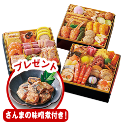 内容量 :和洋中三段重(盛付済)/約2-3人前/全46種 ◎プレゼント/さんまの味噌煮(95g)