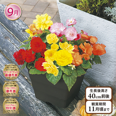 鮮やかな花色と花径6cm以上の中大輪の花が魅力の球根ベゴニア。相性のよい花色をカラフルに寄せ植えました。