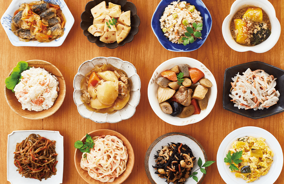 商品のラインナップは煮物系12種とサラダ系8種の全部で20種類!主菜系のものは約150g、副菜系のものは約80gと食べ切りサイズなので、食卓にあと一品足りないときに役立ちます。