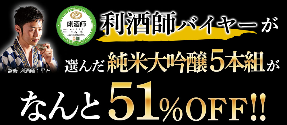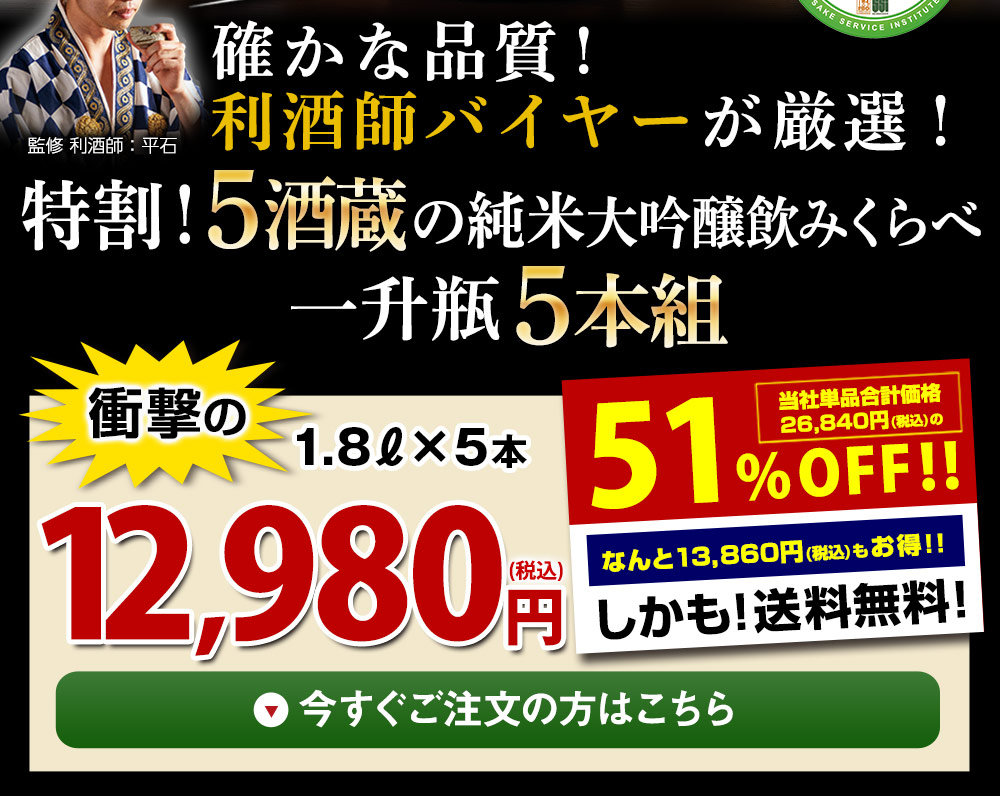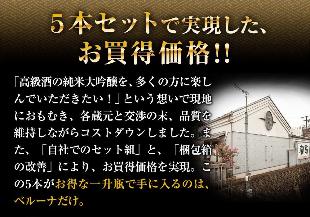 「高級酒の純米大吟醸を多くの人に楽しんでいただきたい!」という想いで現地におもむき、各蔵元と交渉の末、品質を維持しながらコストダウンしました。また「自社でのセットアップ」と「梱包箱の改善」により、お買得価格を実現。この5本がお得な一升瓶で手に入るのは、ベルーナだけ!