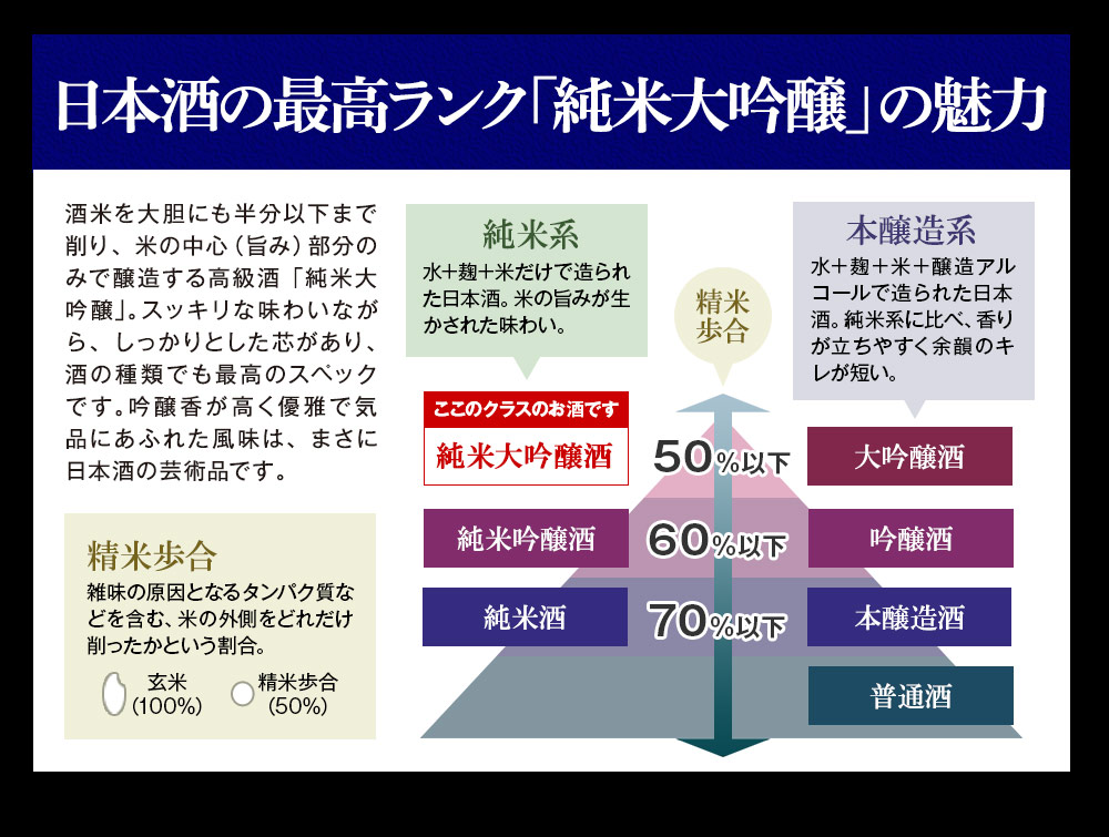 国内でも海外でも多くの人を魅了する大吟醸。その中でも最高峰の純米大吟醸は華やかな香りに加え、純米ならではのしっかりした米の旨味が感じられるのが特長です。