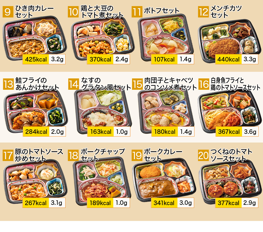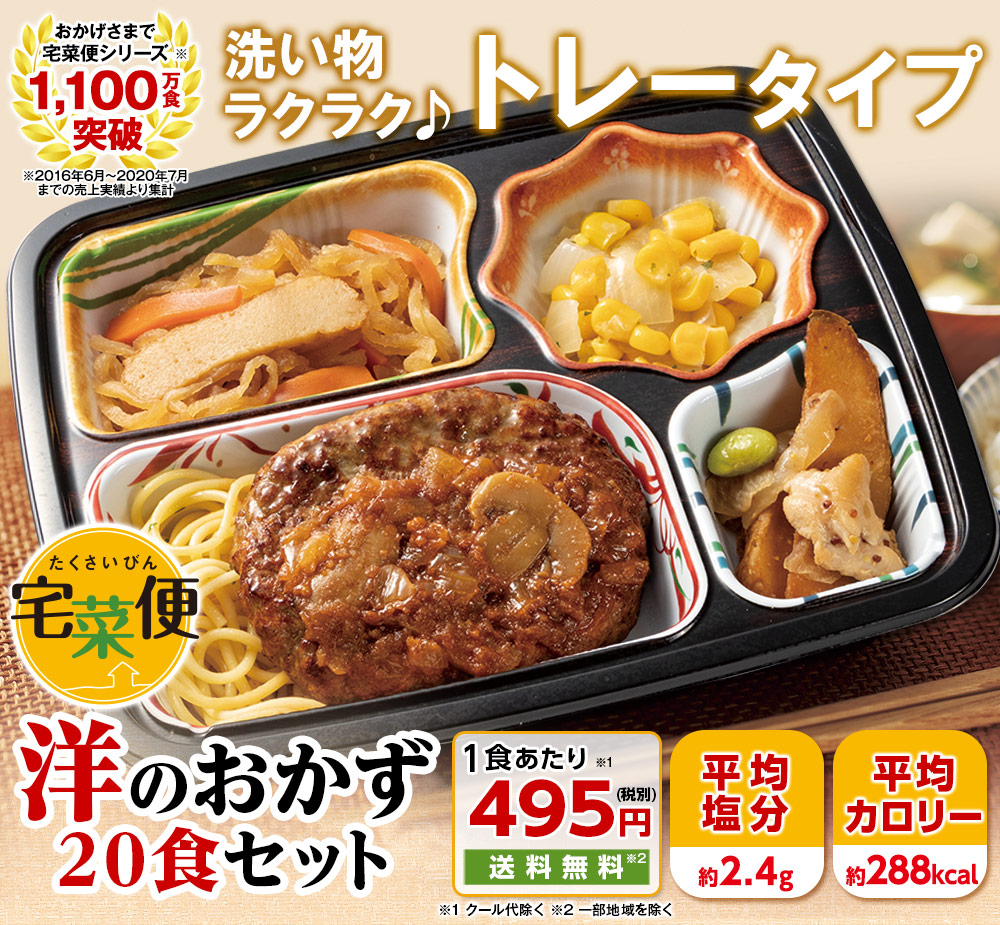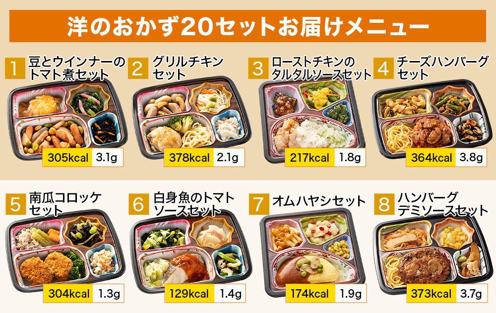 宅菜便の4つのコースから、洋食のおかず20種類。