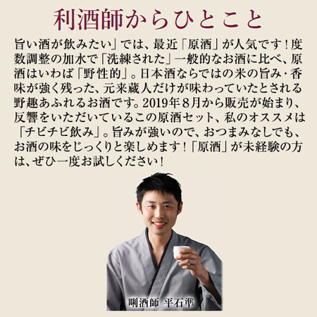 「旨い酒が飲みたい」では、最近「原酒」が人気です!度数調整の加水で「洗練された」一般的なお酒に比べ、原酒はいわば「野性的」。日本酒ならではの米の旨み・香味が強く残った、元来蔵人だけが味わっていたとされる野趣あふれるお酒です。2019年8月から販売が始まり、反響をいただいているこの原酒セット、私のオススメは「チビチビ飲み」。旨みが強いので、おつまみなしでも、お酒の味をじっくりと楽しめます!「原酒」が未経験の方は、ぜひ一度お試しください!