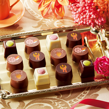 情熱的なカーニバルをイメージしたデザインのギフトボックスにボンボンチョコをアソートしました。