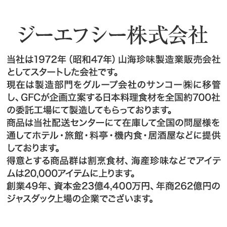 得意とする商品群は割烹食材、海産珍味などでアイテムは20,000アイテムに上ります。