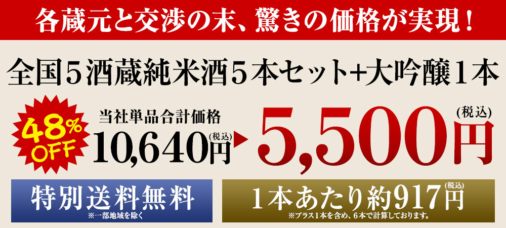 ≪特別送料無料★50%オフ≫全国5酒蔵純米酒5本セット+大吟醸1本