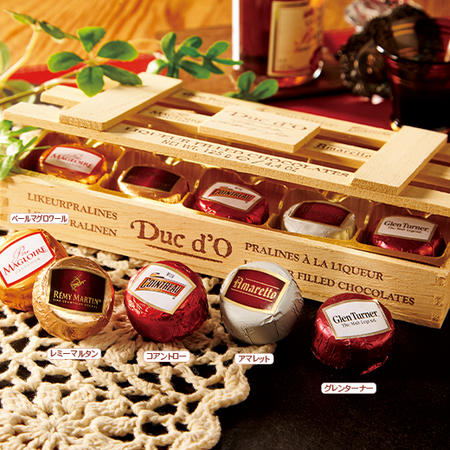 5種の洋酒入りチョコレートを木箱に詰めてお届け。