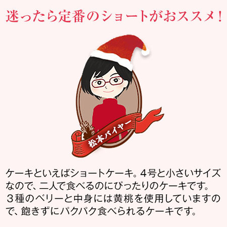 ケーキといえばショートケーキ。4号と小さいサイズなので、二人で食べるのにぴったりのケーキです。3種のベリーと中身には黄桃を使用していますので、飽きずにパクパク食べられるケーキです。