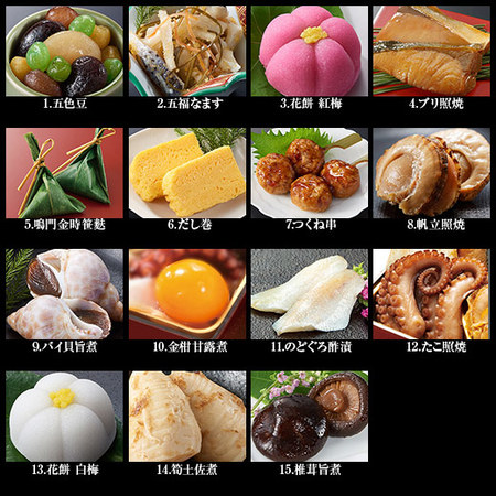 ●五色豆・五福なます・花餅 紅梅・ブリ照焼・鳴門金時笹麩・だし巻・つくね串・帆立照焼・バイ貝旨煮・金柑甘露煮・のどぐろ酢漬・たこ照焼・花餅 白梅・筍土佐煮・椎茸旨煮
