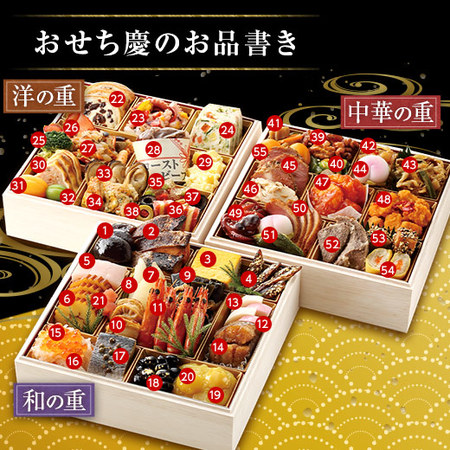 - お届け内容 和洋中三段/約4-5人前/全55種(お重に盛付済でお届けします)