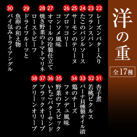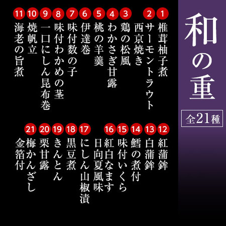 ●椎茸柚子煮・サーモントラウト西京焼き・鶏 の松風・わかさぎ甘露・桃の羊羹・伊達巻・味付数の 子・味付わかめの茎・一口にしん昆布巻・焼帆立・海 老の旨煮・紅蒲鉾・白蒲鉾・鱈の煮付・味付いくら・紅 白なます日向夏風味・にしん山椒漬・黒豆煮・きんと ん・栗甘露・梅かんざし金箔付