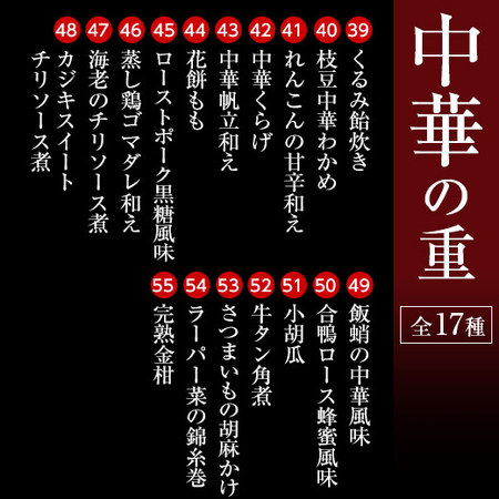 ●くるみ飴炊き・枝豆中華わかめ・れんこんの 甘辛和え・中華くらげ・中華帆立和え・花餅もも・ロース トポーク黒糖風味・蒸し鶏ゴマダレ和え・海老のチリソ ース煮・カジキスイートチリソース煮・飯蛸の中華風 味・合鴨ロース蜂蜜風味・小胡瓜・牛タン角煮・さつま いもの胡麻かけ・ラーパー菜の錦糸巻・完熟金柑