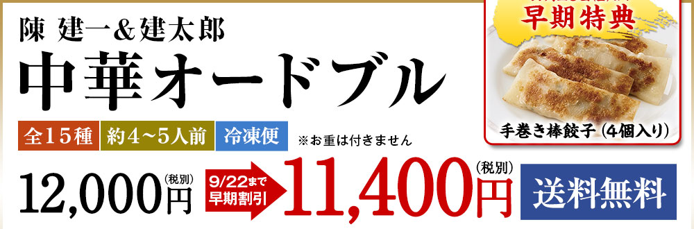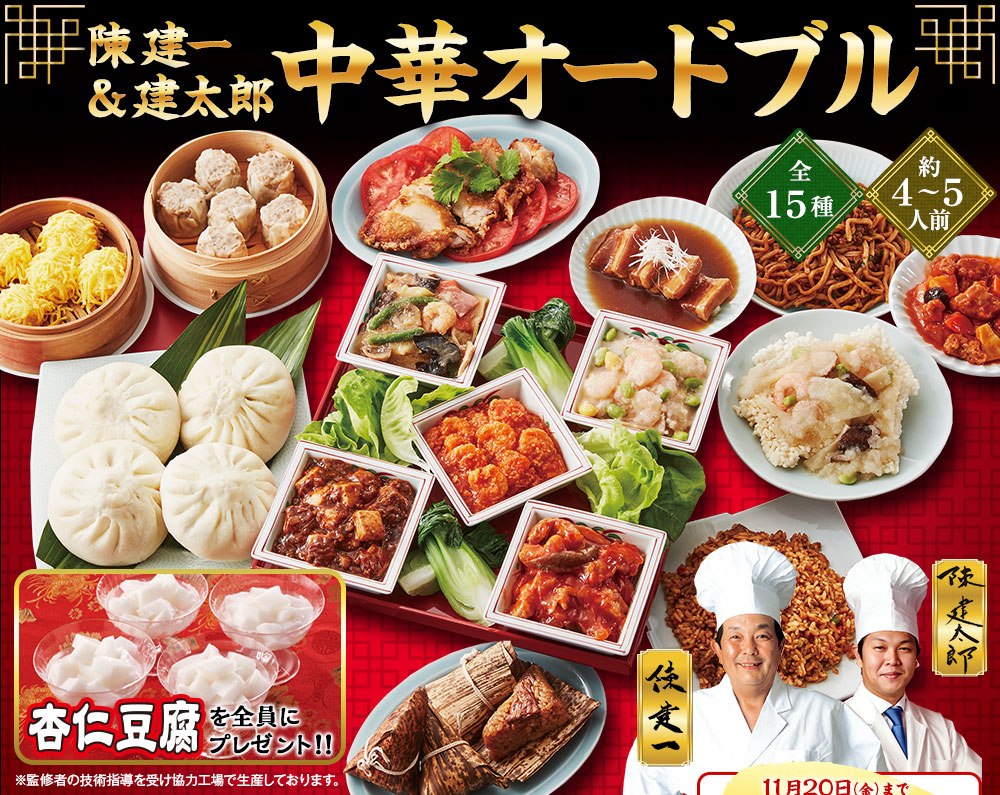 ●陳建一 エビチリソース・陳建一 本格四川麻婆豆腐・陳建一 本格酢豚・陳建一 東坡肉・ 陳建一 油淋鶏(ソース付)・陳建一 海鮮おこげセット・陳建一 錦糸焼売(5個入)・陳建一 本格八宝菜・陳建一 角煮入りちまき(4個入)・陳建一 手包み肉まん(2個入)×2・陳建太 郎 フルーティー酢豚・陳建太郎 四川炒麺・陳建太郎 回鍋肉炒飯・陳建太郎 エビのミルク 炒め・陳建太郎 四川飯店肉焼売(6個入)