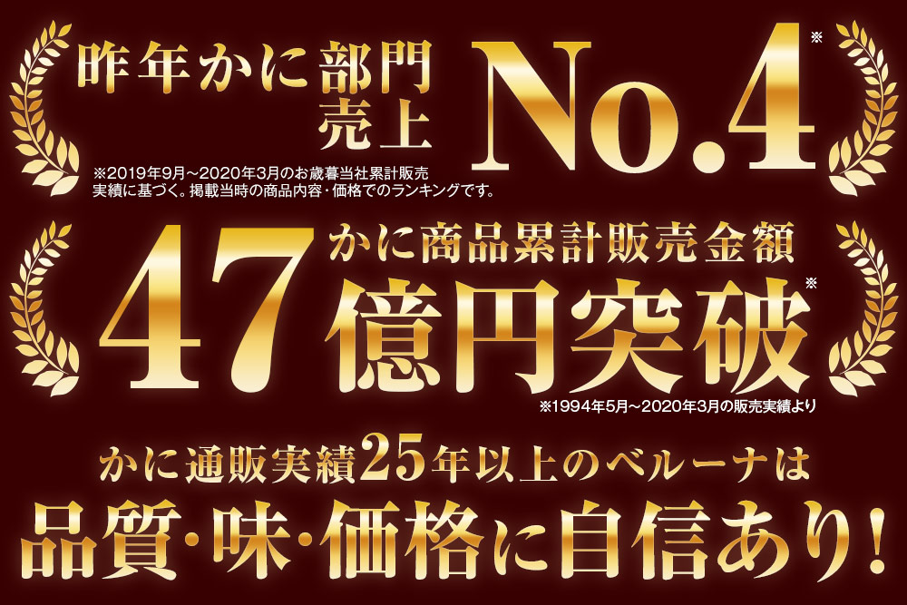 価格設定近年、カニは漁獲量の減少や世界的な需要が増えたことで毎年原料価格が高騰しております。そんな中でも「おいしいカニをたくさんのお客様にお届けしたい」という強い想いで多くの仕入れ先と何度も交渉し、今年も自信をもって「納得の品質と価格」を実現できました。