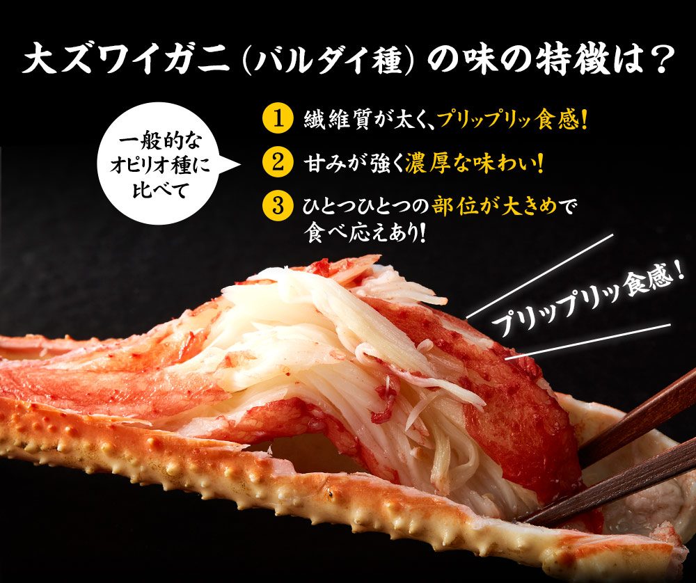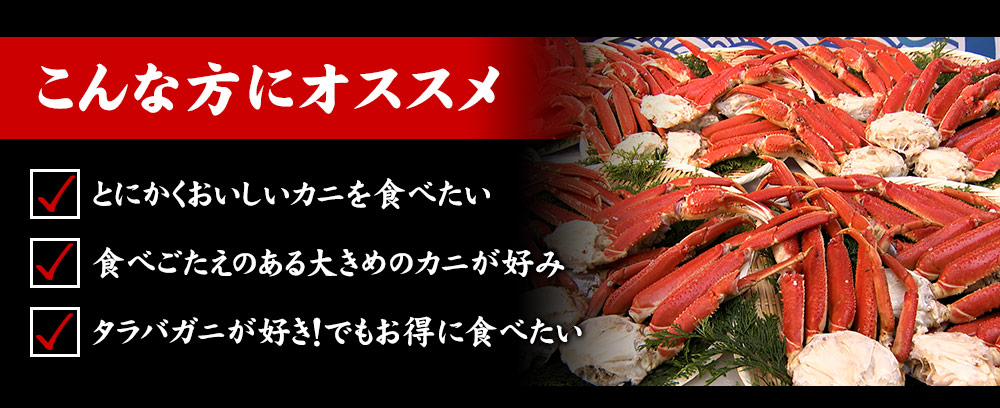 とっても美味しい蟹でした。冷凍焼けのパサパサ感もなく、解凍も素人な私流でも大丈夫でした。蟹の殻も剥きやすかったです。プリプリに甘くて美味!4人家族で十分な量です。40代女性 マミー様