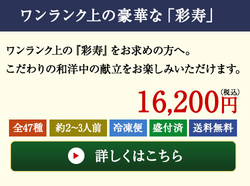 いろいろお節料理の案内をもらいますが、和洋中の三段重で和洋中が量も多すぎず程よくバラエティに富んでるのは彩寿が1番です。娘と2人楽しみながら毎年味わっています。60代 女性 ゆみちゃんばばあ 様 ※個人の感想です。