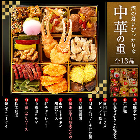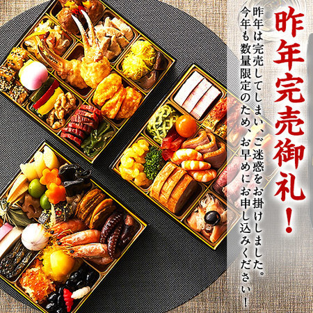 お申込み締切:2021年12月24日(金) - お届け内容 和洋中三段重/約2-3人前/全45種(お重に盛付済でお届けします)