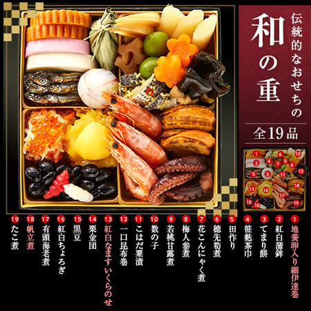 ◆地養卵入り細伊達巻◆紅白蒲鉾◆てまり餅◆笹麩茶巾◆田作り◆穂先筍煮◆花こんにゃく煮◆梅人参煮◆若桃甘露煮◆数の子◆こはだ粟漬◆一口昆布巻◆紅白なますいくらのせ◆栗金団◆黒豆◆紅白ちょろぎ◆有頭海老煮◆帆立煮◆たこ煮