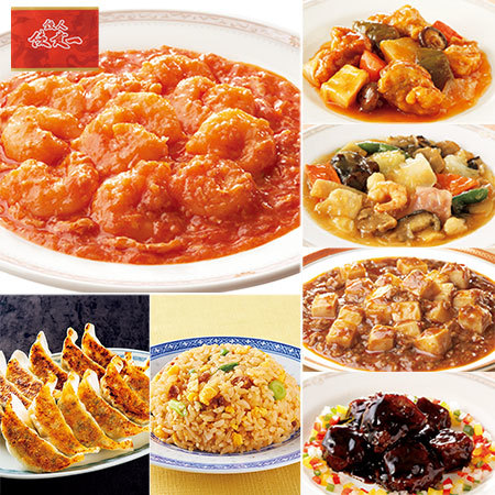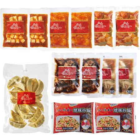 - お届け内容 麻婆豆腐150g×2袋、エビチリソース150g×2袋、酢豚150g×2袋、黒酢スブタ150g×2袋、本格八宝菜150g×2袋、焼豚炒飯200g×2袋、お徳用ぎょうざ400g(20個入)