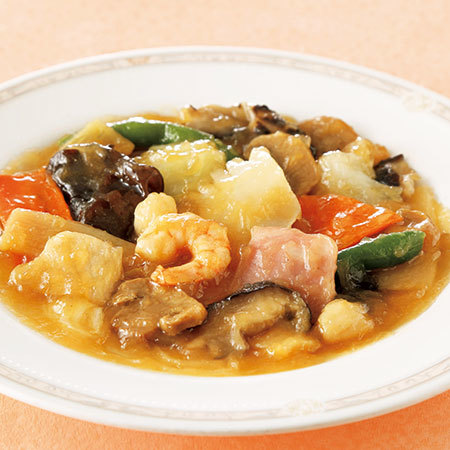 プリプリのいかとえび、白菜、いんげん、たけのこ、にんじんなどが入った具だくさんの八宝菜。