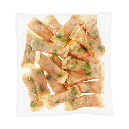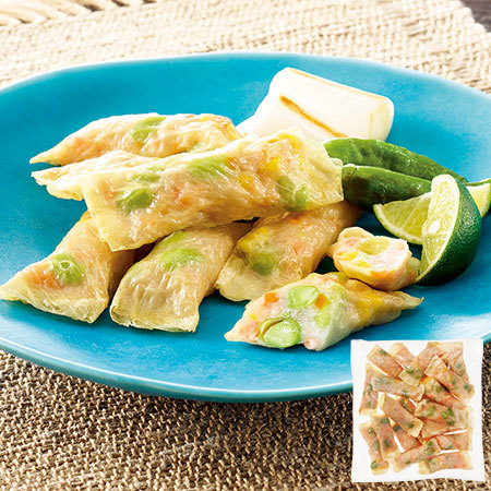 魚肉すり身の中に海老、れんこん、枝豆、コーン、にんじんの5種類の具材を湯葉づくりのプロが一つひとつ丁寧に巻き上げました。ごま油と塩でシンプルに味付け。揚げたり、スープに入れてボイルしても湯葉がはがれにくいように仕上げてあります。■調理方法/揚げる・電子レンジ※写真は盛付参考例です。付け合わせ等は商品に含まれません。※パッケージのデザインは変更になる場合がございます。
