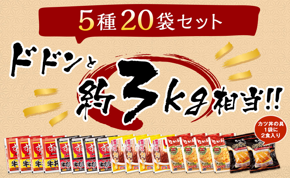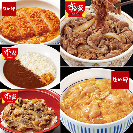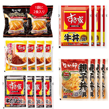 - お届け内容 すき家 牛丼の具135g×4袋(2袋×2セット)、すき家 牛カルビ丼の具120g×4袋、すき家 横濱カレー220g×4袋、なか卯 親子丼の具145g×4袋、なか卯 カツ丼の具150g×4食(2食×2袋)
