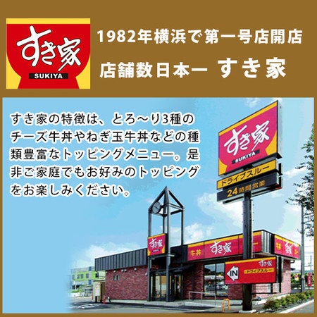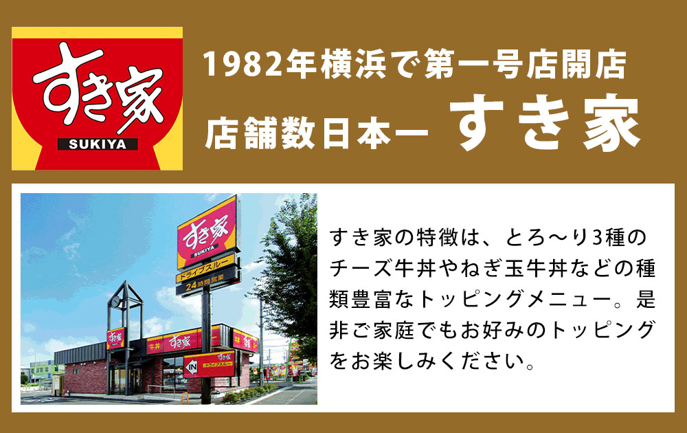 種類豊富なトッピングメニューを楽しめる牛丼やカレーなどが人気の「すき家」。
