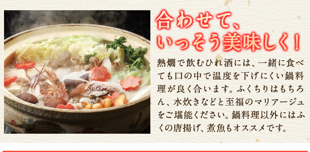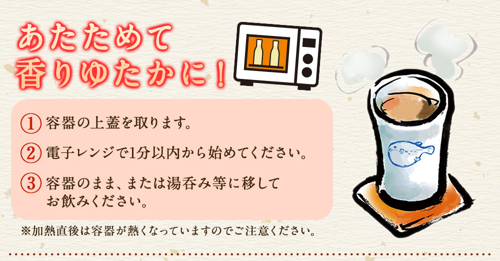 辛口本醸造酒をベースに、焼きひれの香ばしさと焼きふぐのまろやかな旨味を抽出し、おいしいタイミングでひれを取り除きました。温めることで香りがより豊かになります。