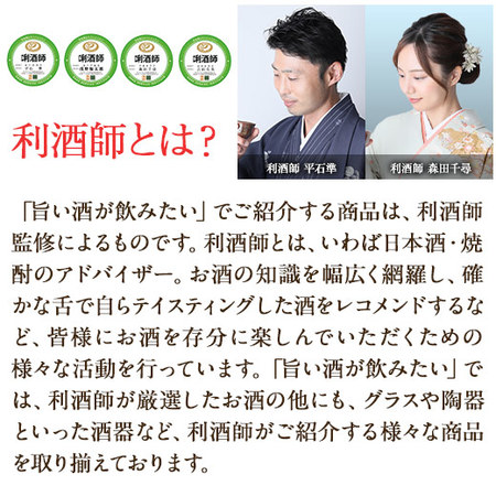 「旨い酒が飲みたい」でご紹介する商品は、利酒師監修によるものです。利酒師とは、いわば日本酒・焼酎のアドバイザー。お酒の知識を幅広く網羅し、確かな舌で自らテイスティングした酒をレコメンドするなど、皆様にお酒を存分に楽しんでいただくための様々な活動を行っています。「旨い酒が飲みたい」では、利酒師が厳選したお酒の他にも、グラスや陶器といった酒器など、利酒師がご紹介する様々な商品を取り揃えております。