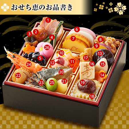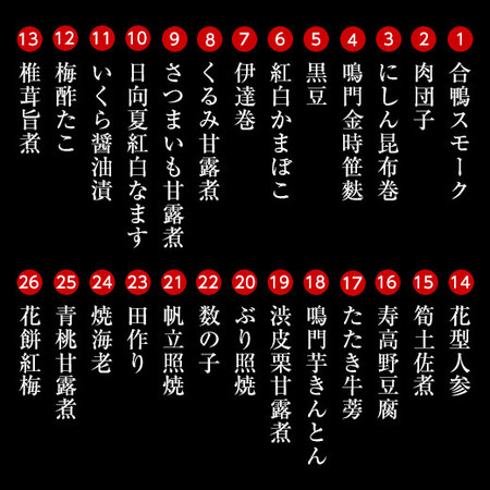●合鴨スモーク・肉団子・にしん昆布巻・鳴門金時笹麩・黒豆・紅白かまぼこ・伊達巻・くるみ甘露煮・さつまいも甘露煮・日向夏紅白なます・いくら醤油漬・梅酢たこ・椎茸旨煮・花型人参・筍土佐煮・寿高野豆腐・たたき牛蒡・鳴門芋きんとん・渋皮栗甘露煮・ぶり照焼・数の子・帆立照焼・田作り・焼海老・青桃甘露煮・花餅紅梅