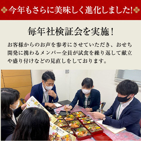 お客様からのお声を参考にさせていただき、おせち開発に携わるメンバー全員が試食を繰り返して献立や盛り付けなどの見直しをしております。