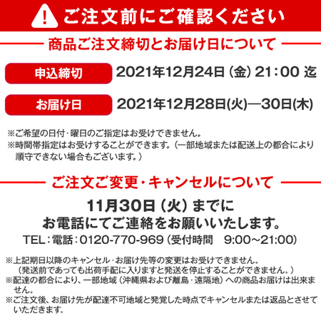 ご注文完了後、お申込のキャンセル・お届け先などの変更等は、ご注文当日中にご連絡をお願いいたします。