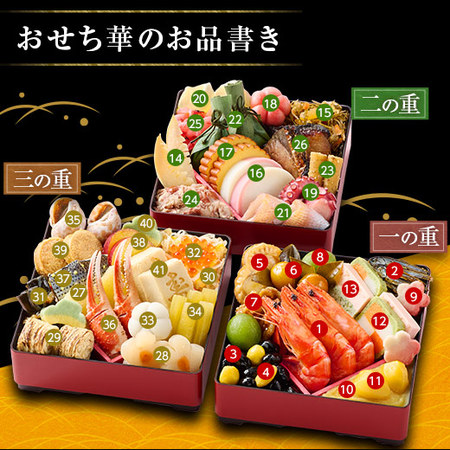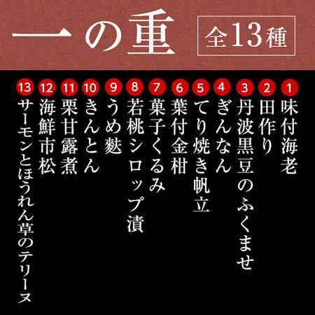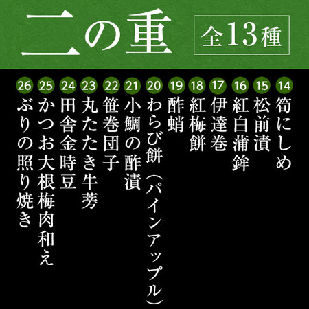 味付一口数の子・梅花こんにゃく・焼き湯葉巻・柚子入り生酢・昆布巻・いくら醤油漬・白梅餅・蕗にしめ・味付けばい貝・かに爪みりん漬・こはだ粟漬・甘露いもレモン煮・魚卵の旨煮・まつ麩・寿焼印高野豆腐