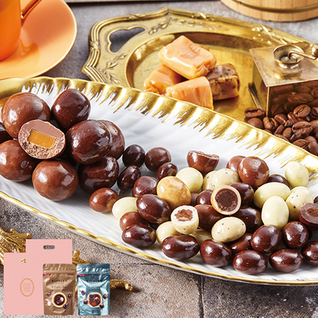 ビターなコーヒー豆のチョコとキャラメル入りチョコの2種類をお届け。