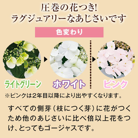 圧巻の花つき!ラグジュアリーなあじさいです。すべての側芽(枝につく芽)に花がつくため他のあじさいよりも多くの花をつけ、とってもゴージャスです。