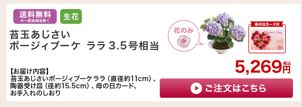 苔玉あじさいポージィブーケララ(直径約11cm)、陶器受け皿(径約15.5cm)、母の日カード、お手入れのしおり -