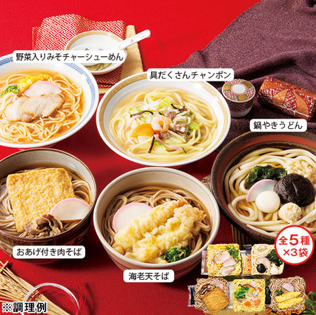 (野菜入りみそチャーシューめん、具だくさんチャンポン、海老天そば、鍋やきうどん、おあげ付き肉そば(各めん150g)) - 商品について 冷凍60日目安