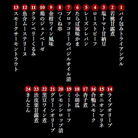 ◆パイ包みトライアングル◆若桃甘露煮◆塩トマト甘納豆◆ローストビーフ◆レーズンレパン◆たらば風味かま◆ブロッコリーのバジルオイル漬◆つくね串◆金柑ワイン風味◆鶏のジェノベーゼ◆クランベリーくるみ◆魚介ムーステリーヌ◆スモークサーモントラウト◆ライプオリーブ◆オニオンマリネ◆合鴨スモーク◆杏子煮◆小胡瓜◆ミートローフ◆レモンシロップ漬◆グリーンオリーブ◆黒豆ワイン煮◆渋皮栗甘露煮◆きんとん