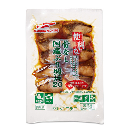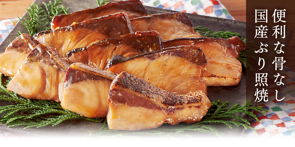骨取りした国産ぶりを使用。しっとりやわらかな口当たりの照焼です。まろやかでコクのある少し甘めのタレで味付け。