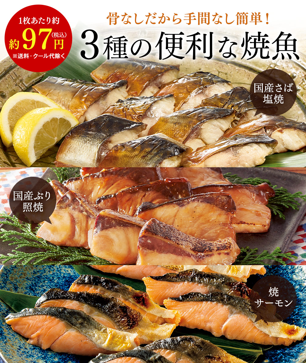 国産さば塩焼、国産ぶり照焼、焼サーモンのお得な3種セット